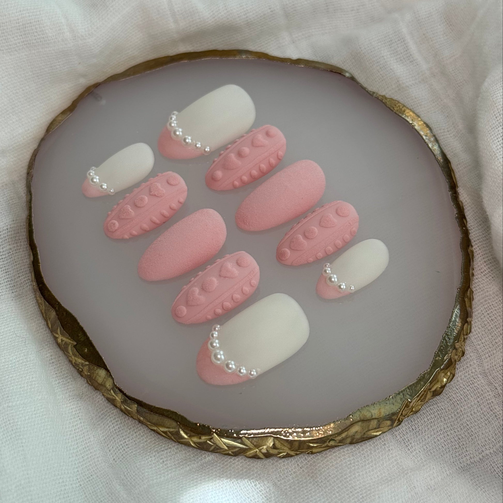 A soft and feminine winter-inspired set featuring blush pink sweater-texture nails, matte pink accents, and creamy pearl-lined French tips. Designed for cozy season with a touch of elegance, this set blends warmth, texture, and delicate detail for the perfect cold-weather mani.