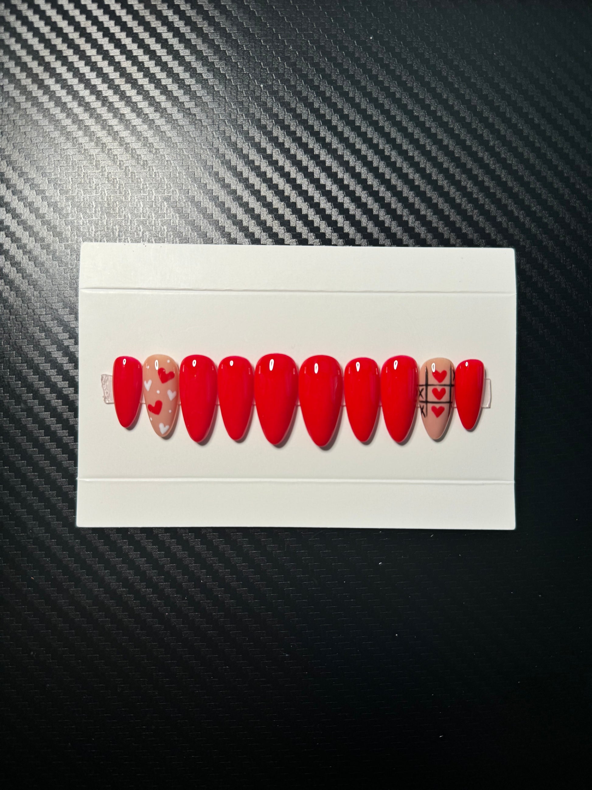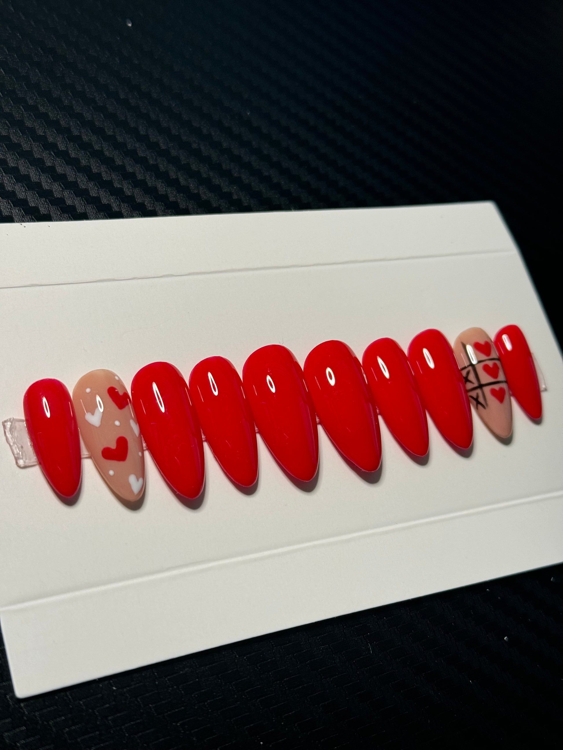 Playful, bold, and a little flirty — just like your favorite Valentine. Crush Mode is a vibrant red nail set with a sweet twist. One accent nail features scattered red and white hearts, while the other plays it cute with a heart-filled tic-tac-toe board. It’s romantic, fun, and perfect for showing off a little love — whether it’s Valentine’s Day or just a treat yourself moment.