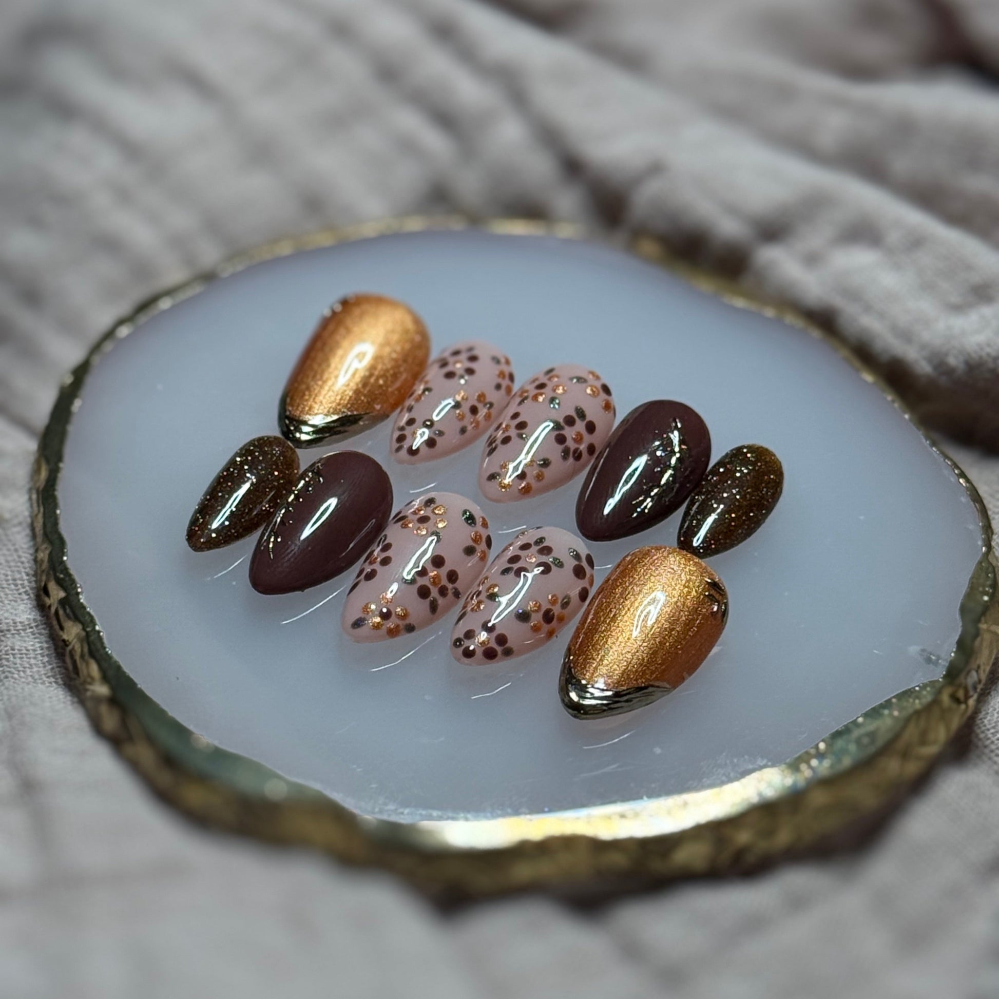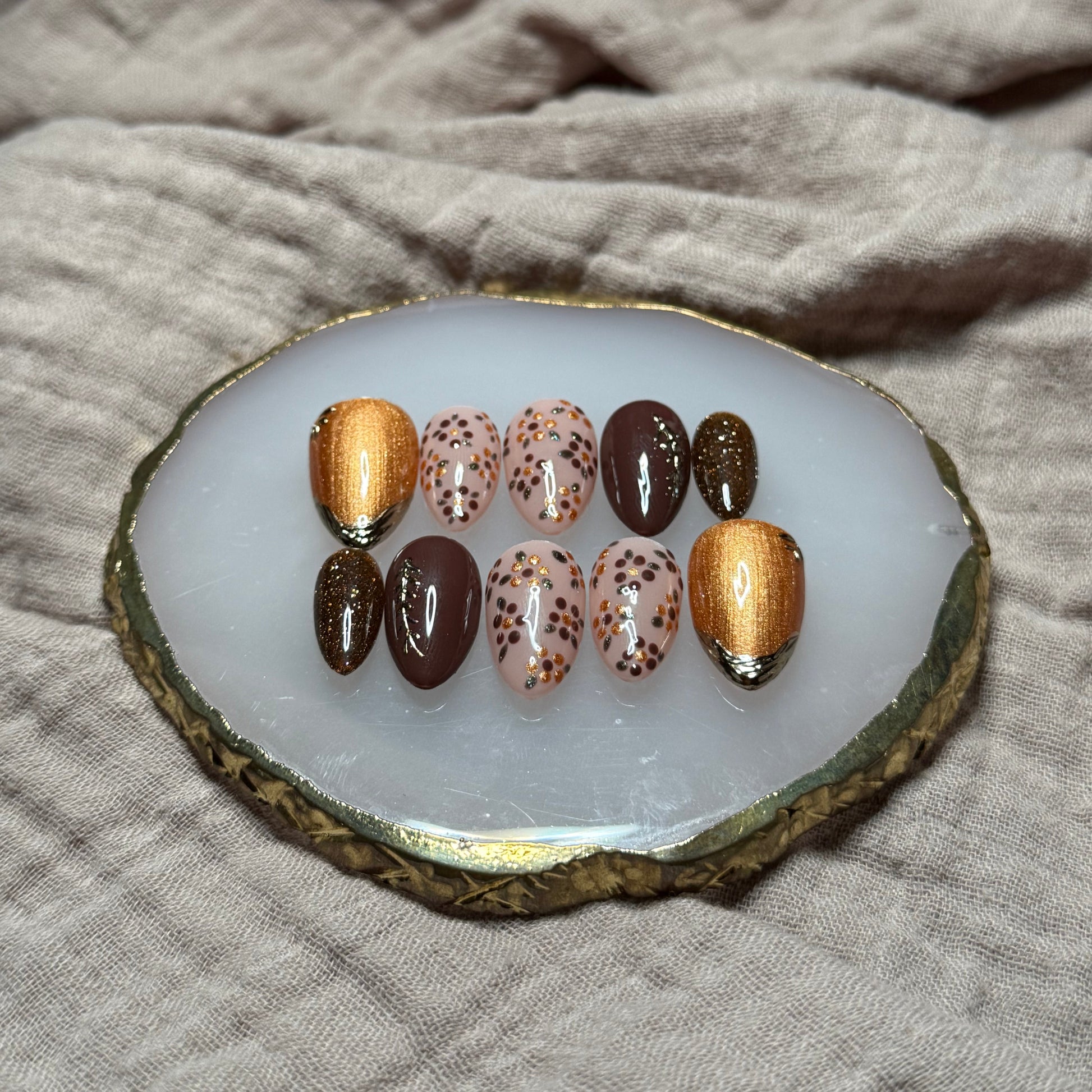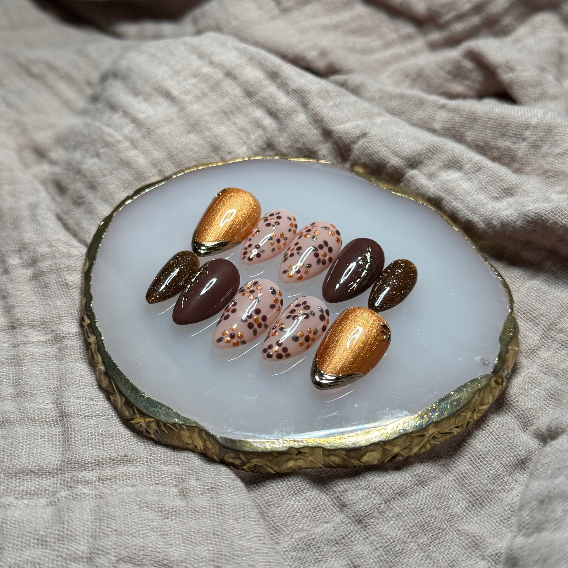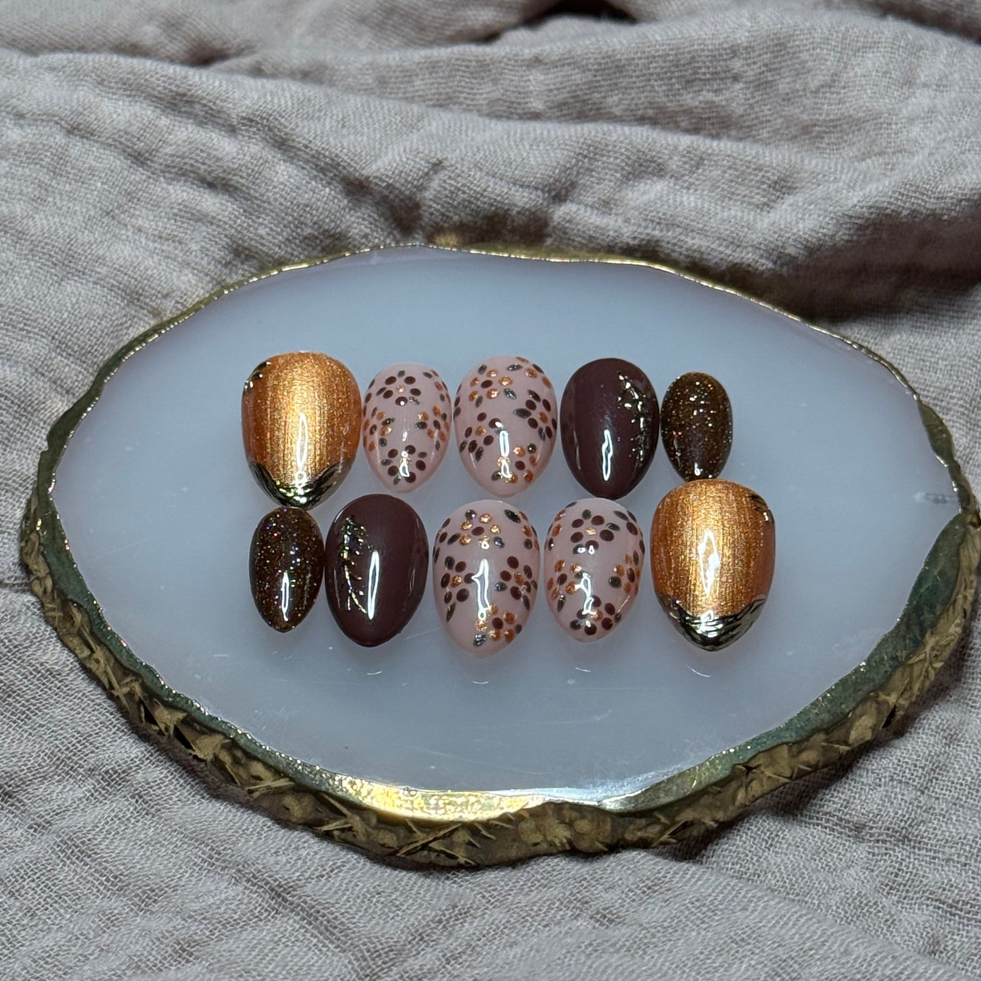 A warm blend of cozy florals and autumn golds — this set features hand-painted fall blooms, deep maroon tones, and a glowing amber metallic accent that catches every bit of light. Perfect for sweater weather and pumpkin-spice days, Harvest Bloom is your go-to fall statement without being over the top.