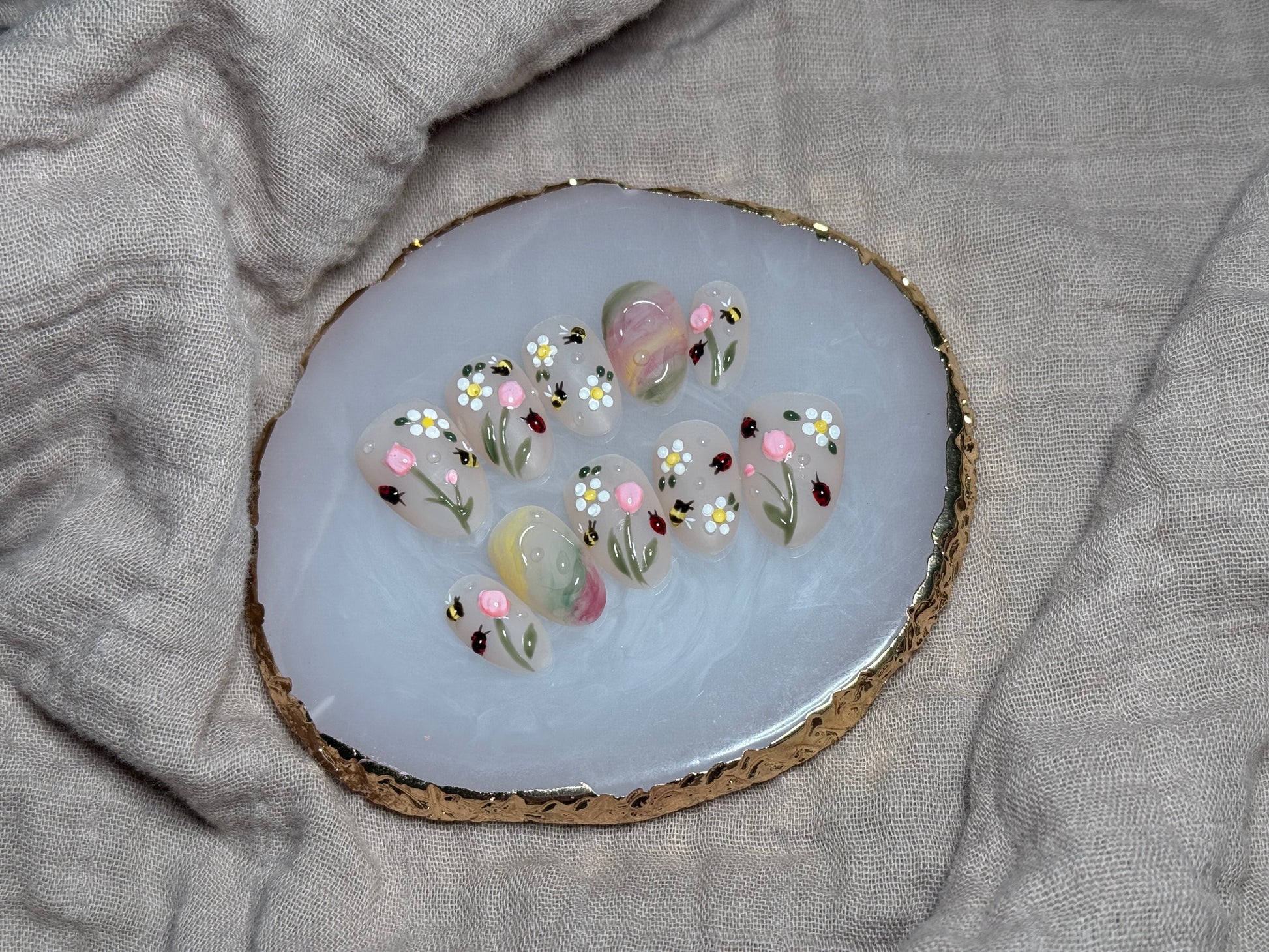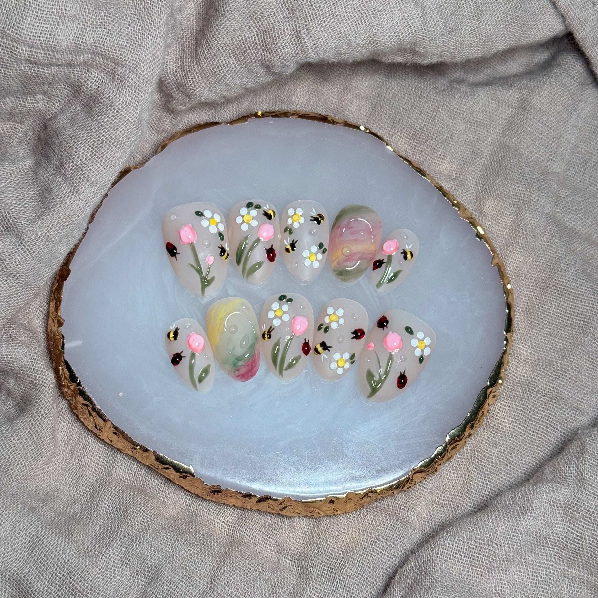Bring a touch of whimsy to your fingertips with our handcrafted Spring Garden Party press-on nails. Each nail is a miniature canvas, featuring hand-painted florals, buzzing bees, and tiny ladybugs set against a soft nude base. Accented with delicate daisies and pastel marble swirls, this set evokes the charm of a blooming meadow. Made for comfort and reusability, these nails are perfect for adding a fresh, playful look to your everyday style or special occasion.