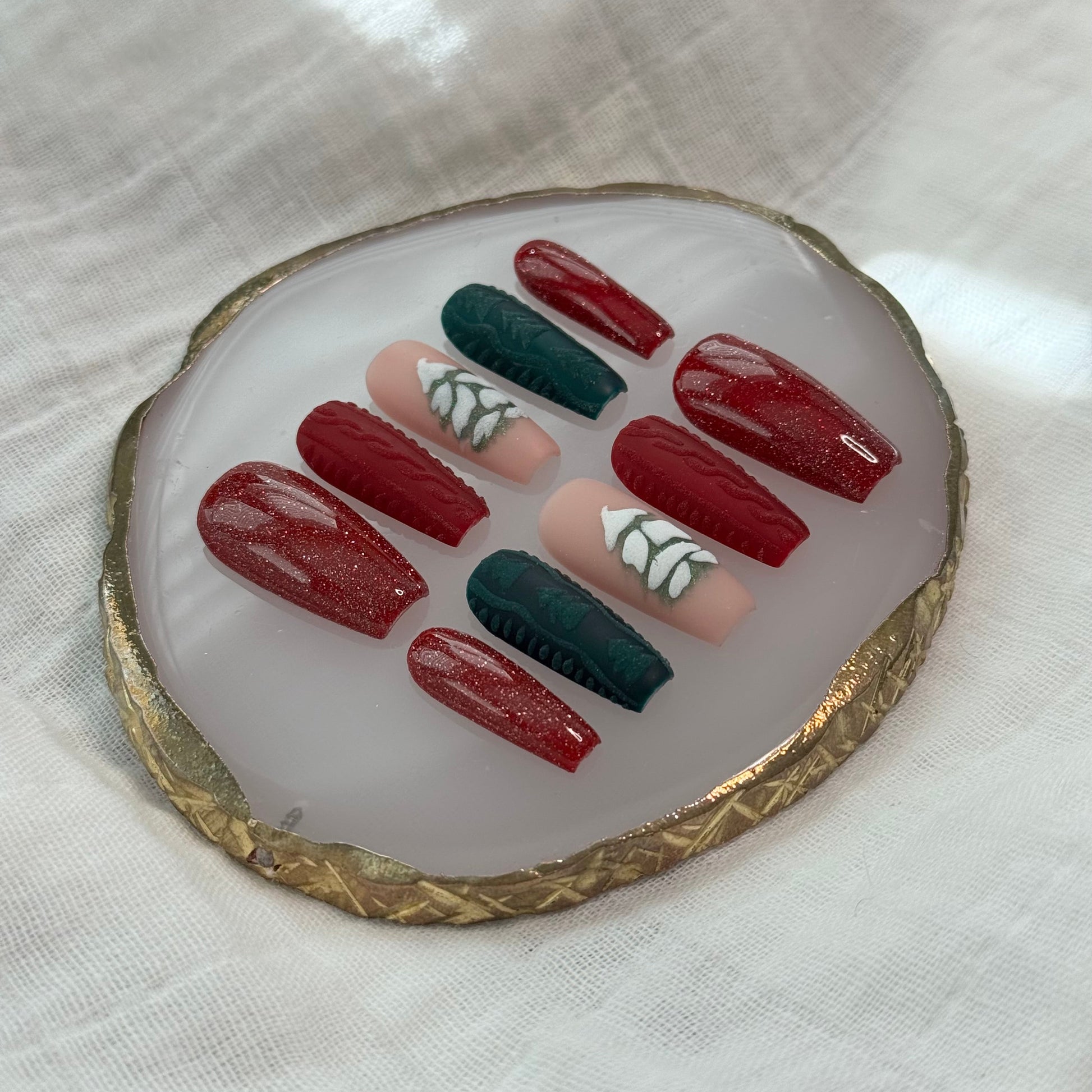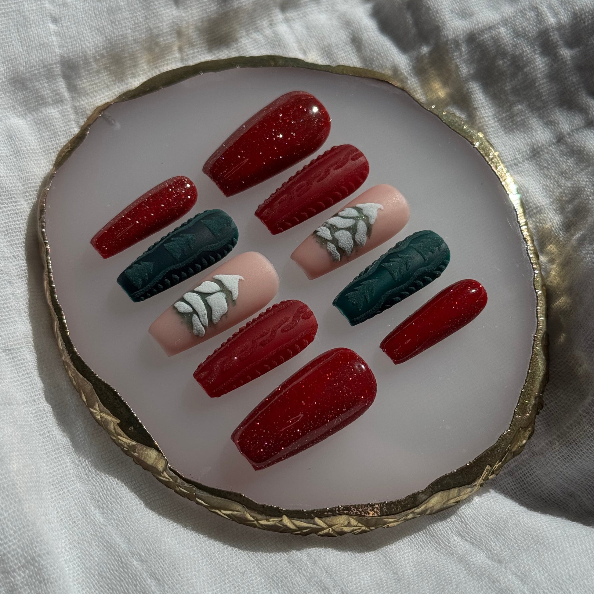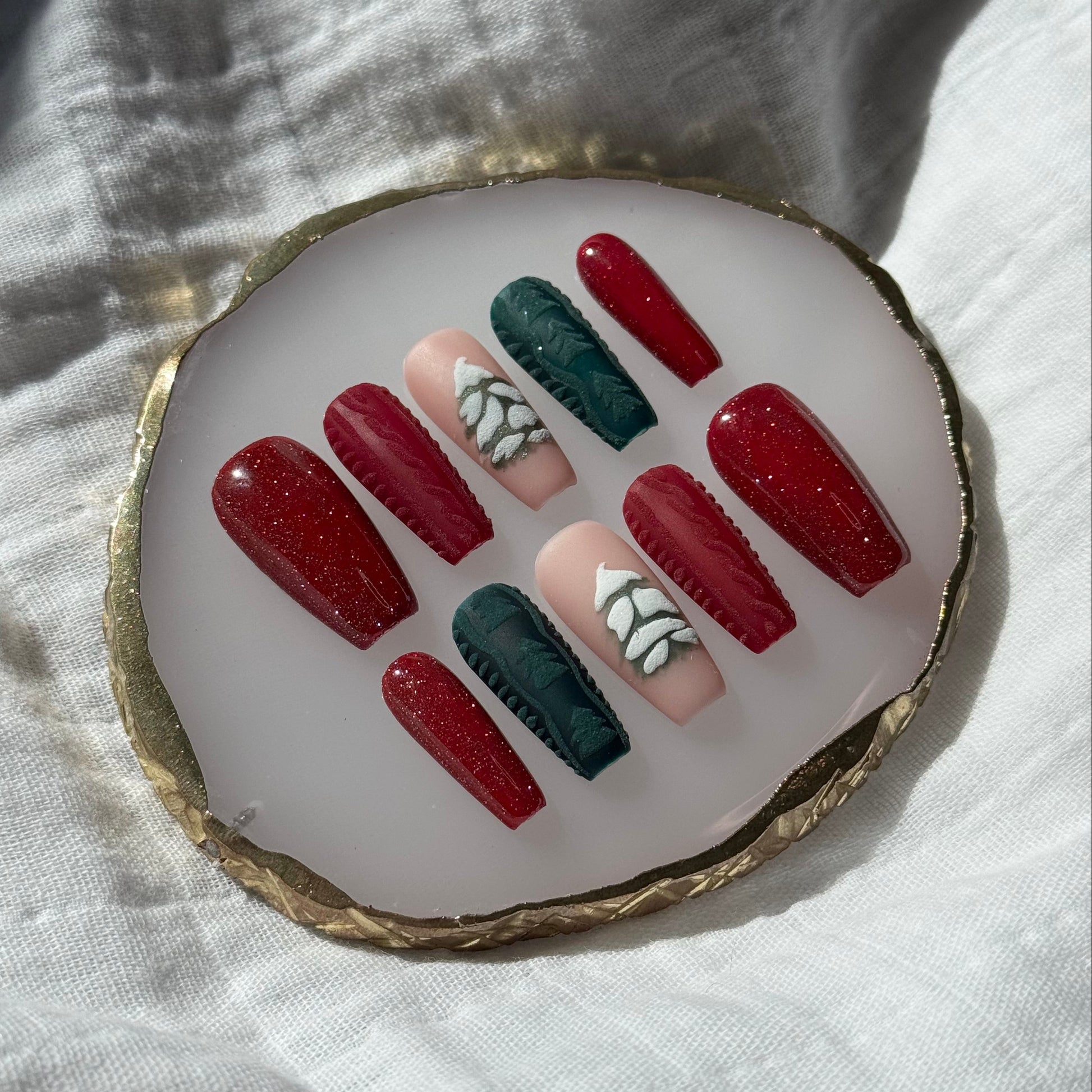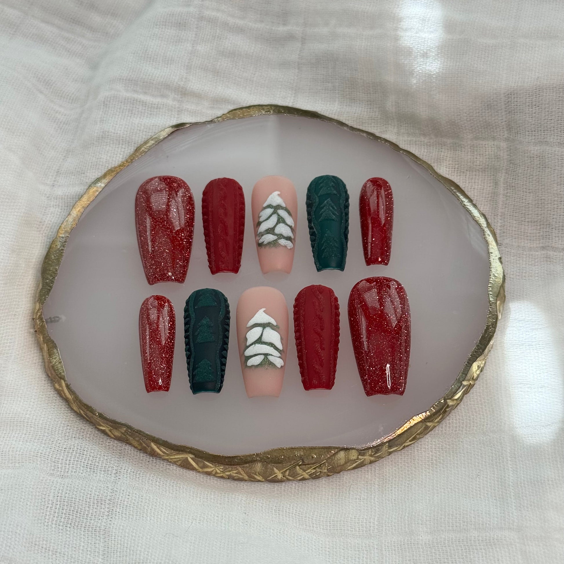 A cozy Christmas set inspired by all your favorite holiday textures and tones. Featuring deep red glitter nails, raised red and green sweater-knit accents, and a hand-painted snowy Christmas tree, this design blends sparkle, warmth, and festive charm. Perfect for holiday parties, Christmas morning photos, or anyone who loves a classic Christmas aesthetic with a soft, wintery twist.