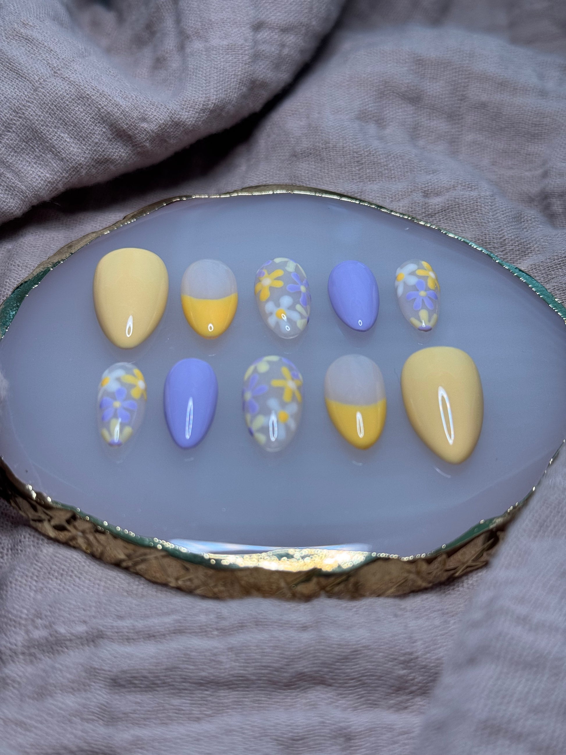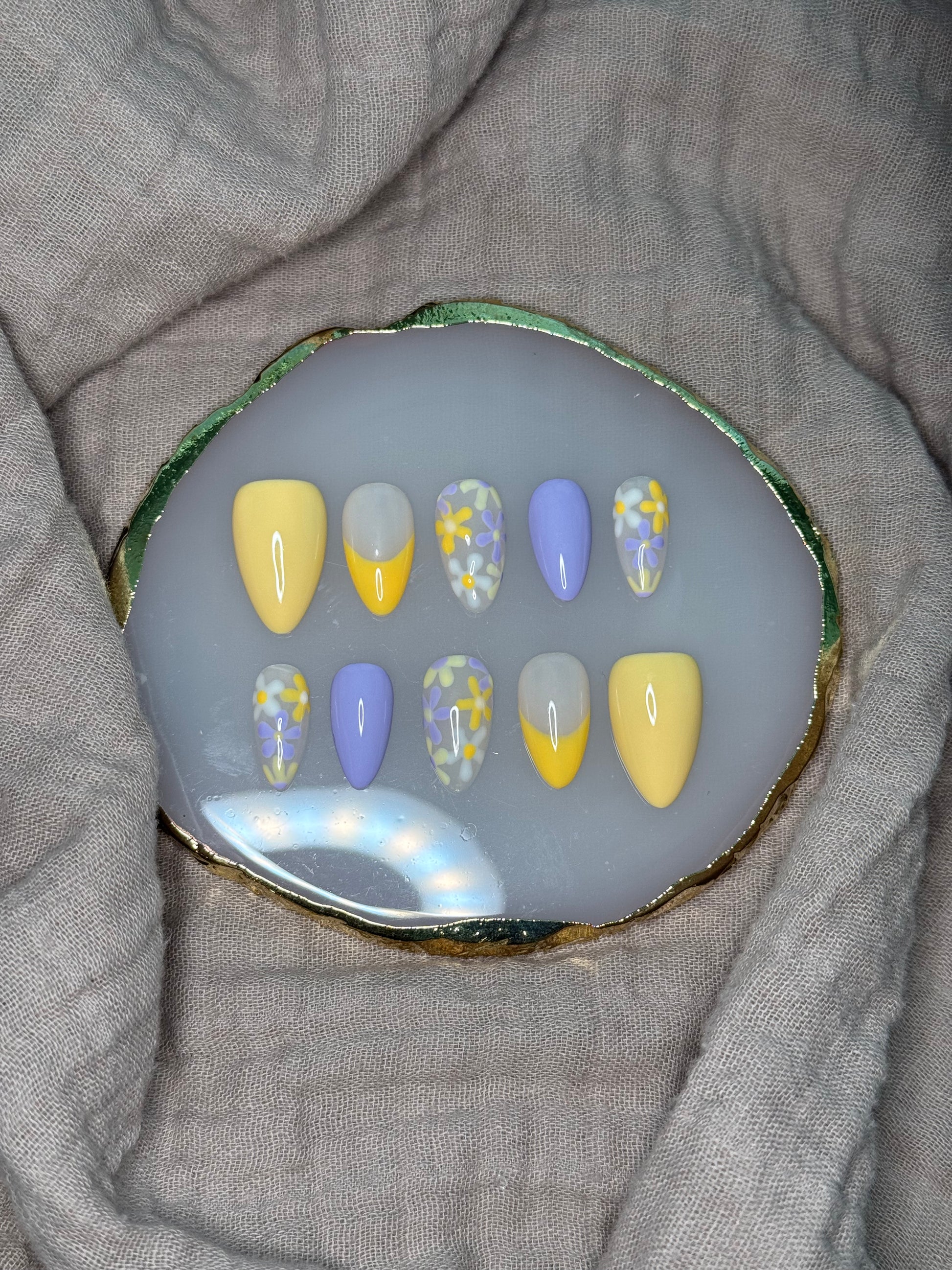 Wild Bloom bursts with joyful color and floral charm. Featuring sunny yellow-orange French tips and delicate hand-painted flowers in shades of yellow, purple, and white, this set brings garden-party vibes with a playful, artistic twist.